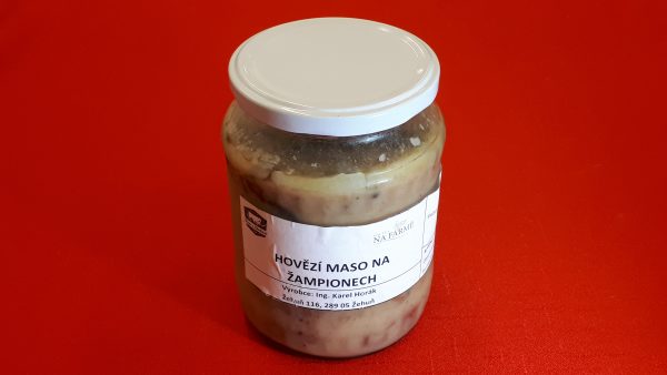 Složení: Hovězí maso (15,94 %), čerstvá zelenina (cibule, žampiony) , pepř, kmín, sůl (2,41 %), olej, česnek, pepř, majoránka, sůl (1,84 %), mouka hladká, olej
