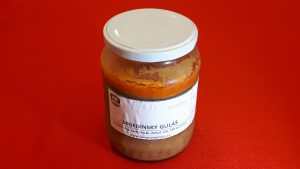 Složení: Vepřové maso (33,33 %), čerstvá zelenina (cibule), pepř, paprika mletá, kmín, kysané zelí (zelí bílé, sůl, kmín, voda), sůl (0,5%), mouka hladká , olej